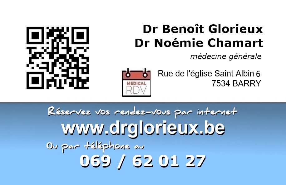 Le Dr GLORIEUX travaille avec le Dr Noémie CHAMART. Vous pouvez prendre RDV sur ce site chez chacun de ces médecins.